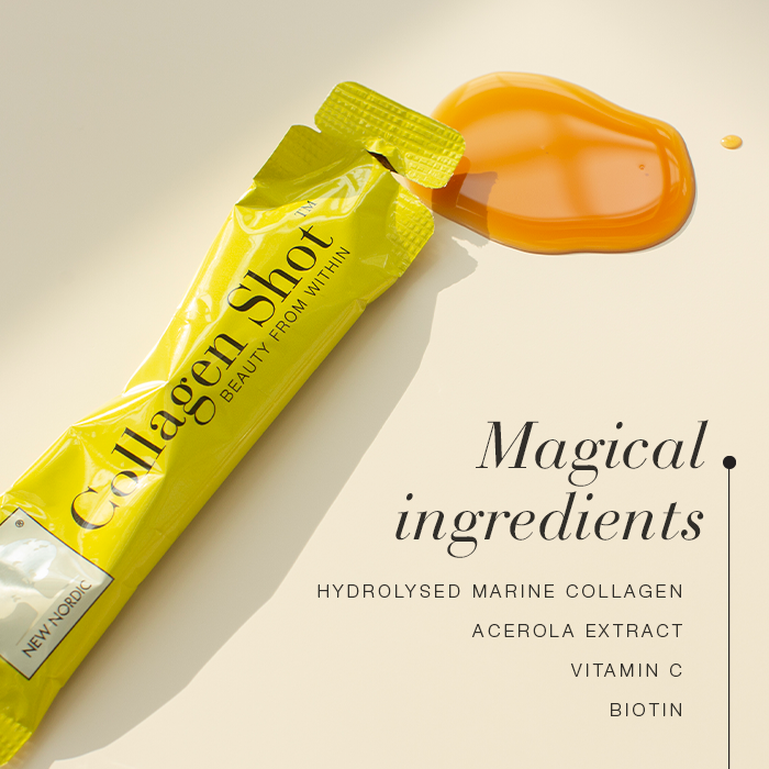 We believe the real magic behind our beauty starts deep beneath our skin. Collagen has the power to boost our skin’s elasticity, reduce fine lines and sustain that healthy glow. Our body naturally produces collagen by combining amino acids and proline, but the secret ingredient essential to this partnership is vitamin C. We have purposely included vitamin C in our New Nordic Collagen Shot™ to ensure your skin soaks up every drop of goodness.